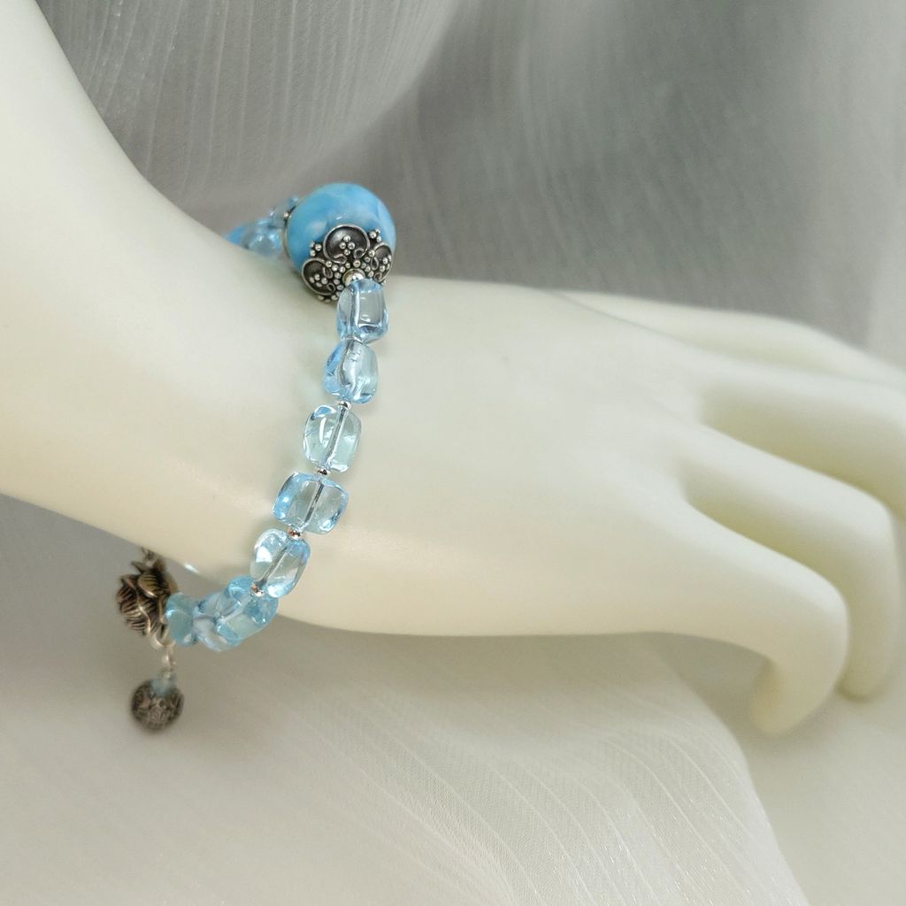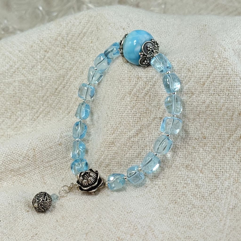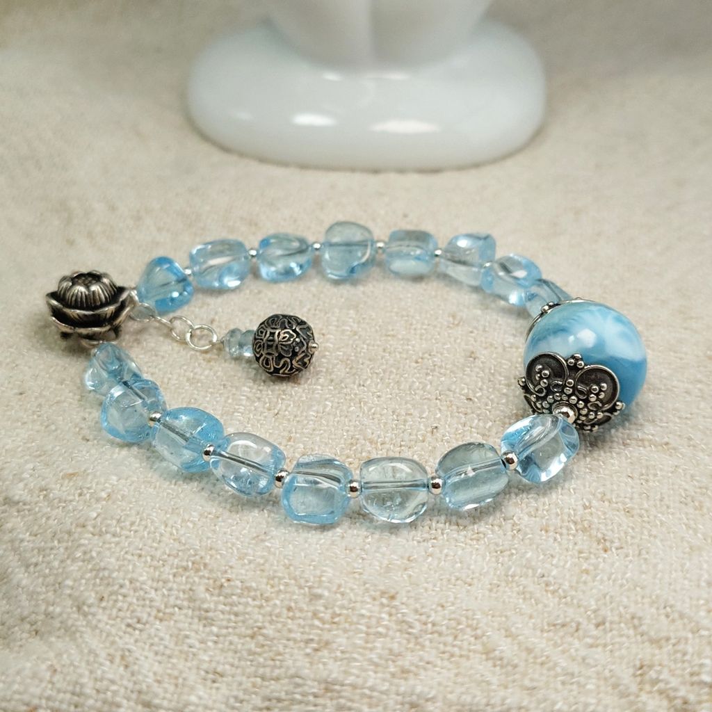 手鍊 藍 拓帕石 拉利瑪 海紋石 海藍寶 手珠 925銀飾 蓮花 寶石