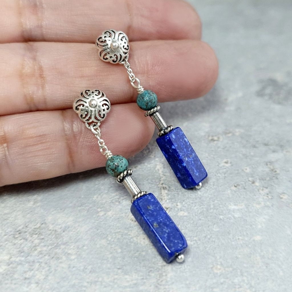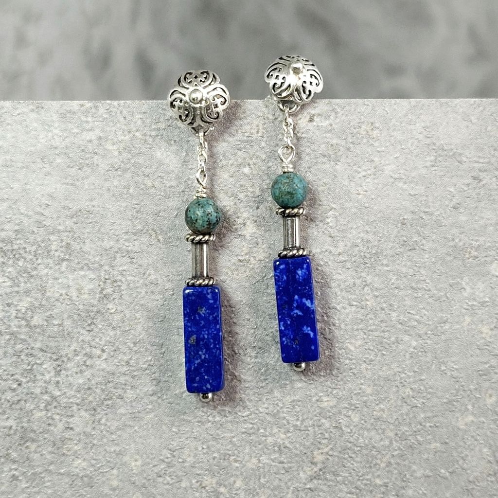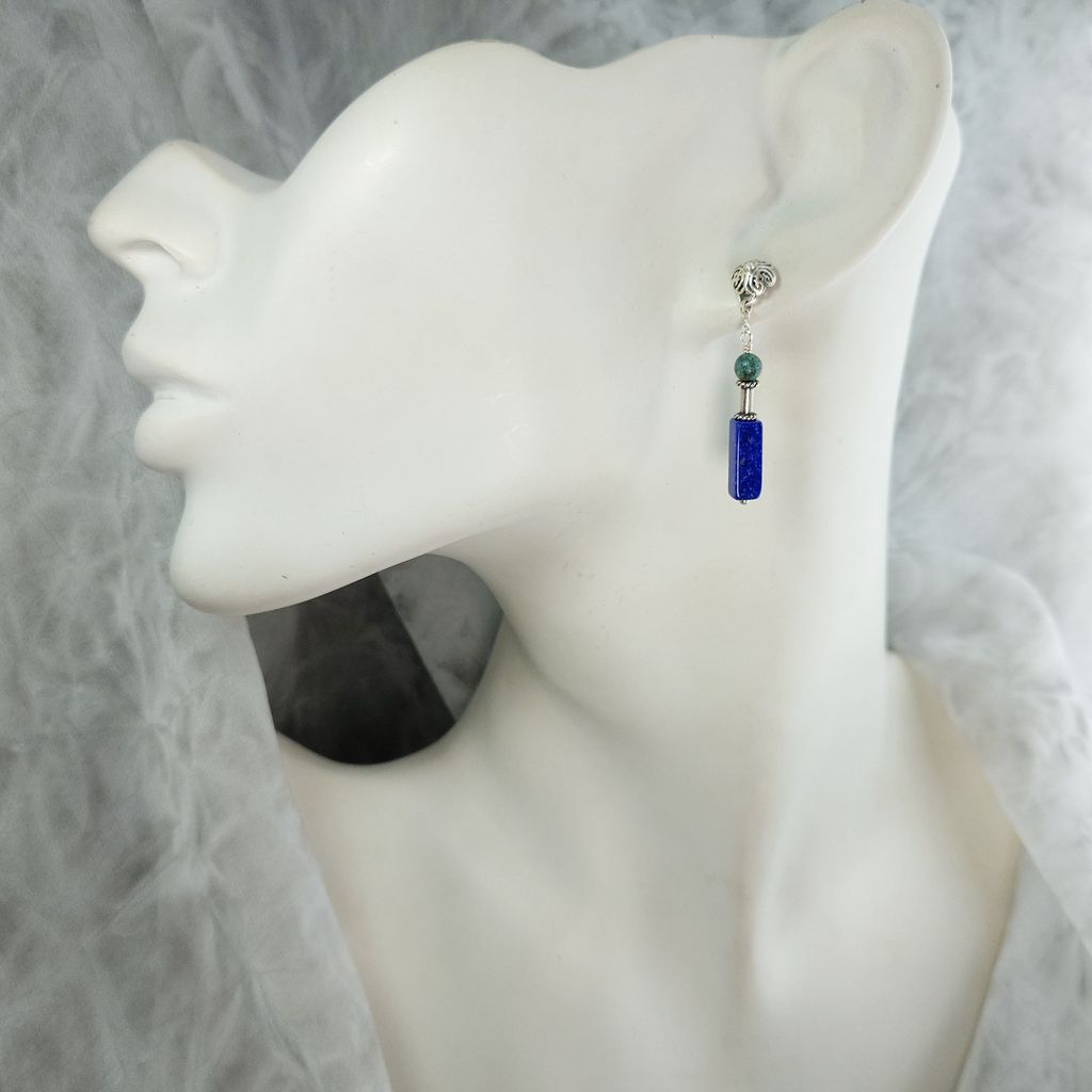 天然青金石 綠松石 手工銀飾長墜鍊耳環