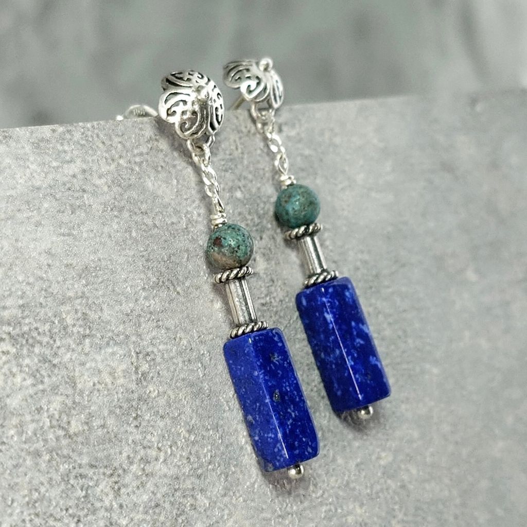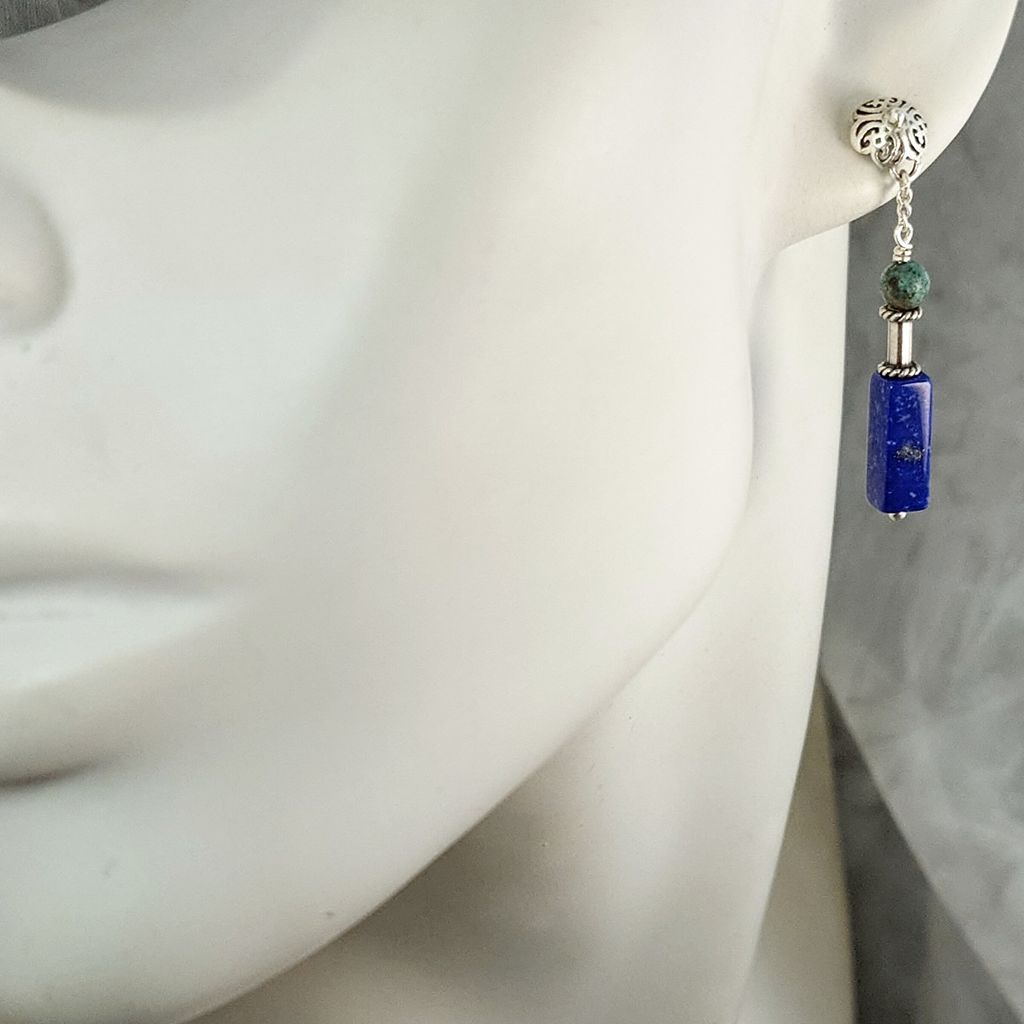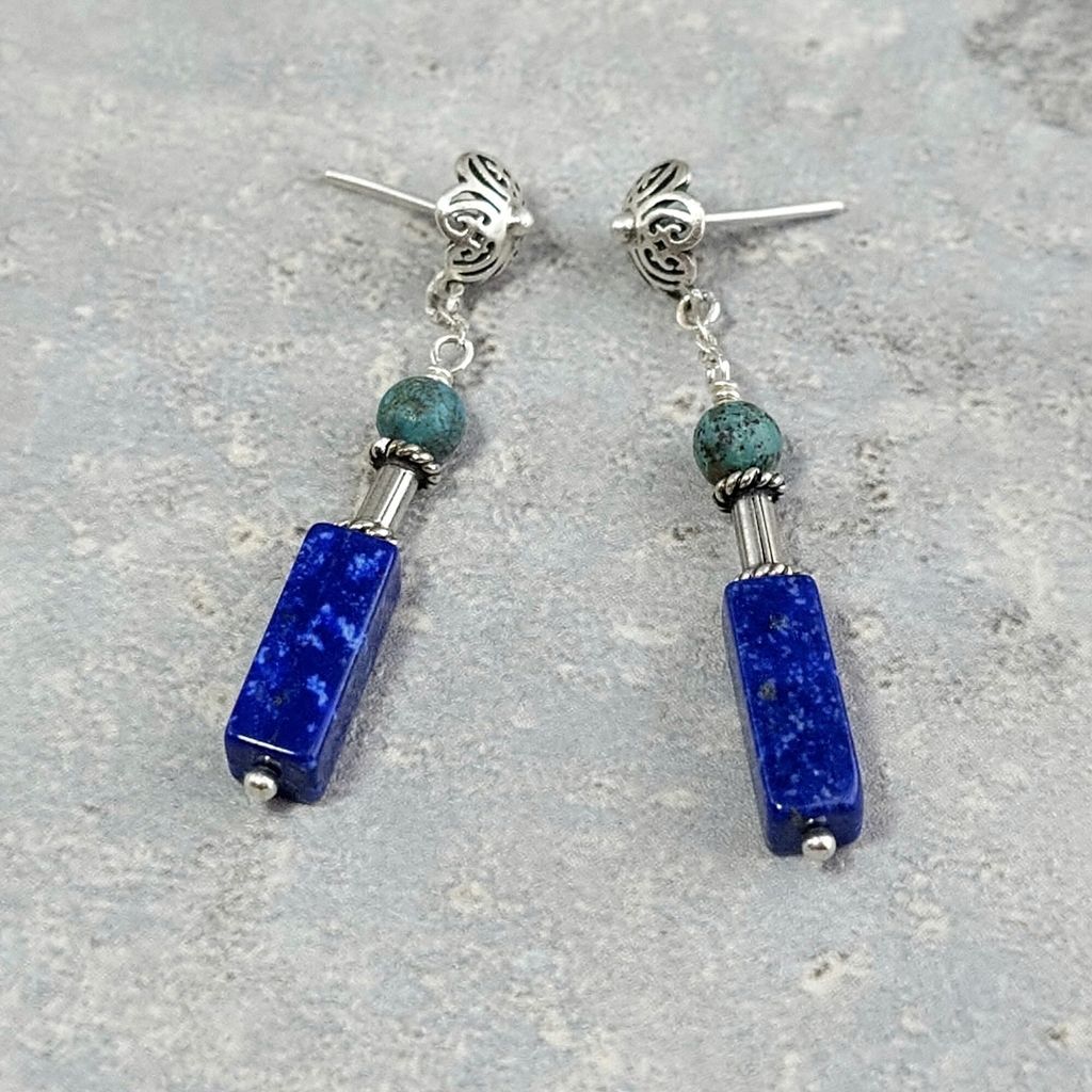 天然青金石 綠松石 手工銀飾長墜鍊耳環