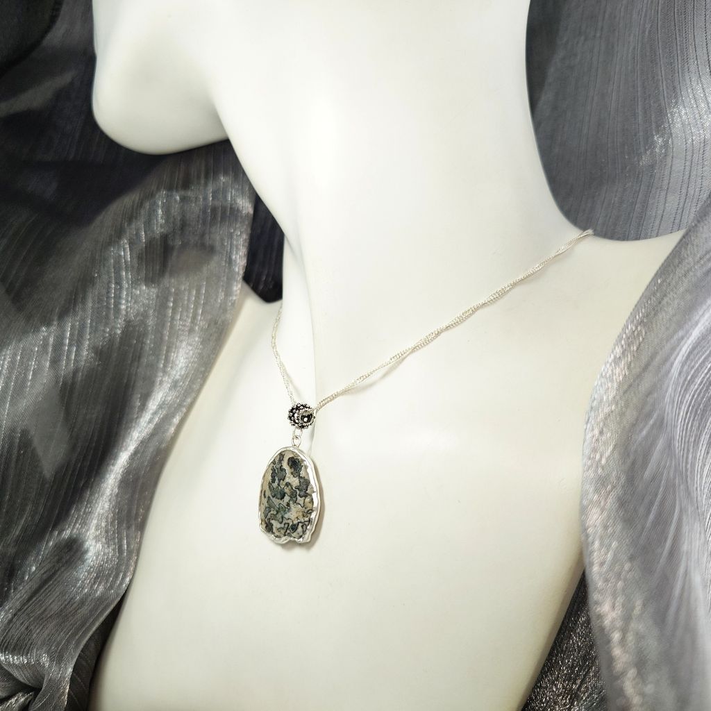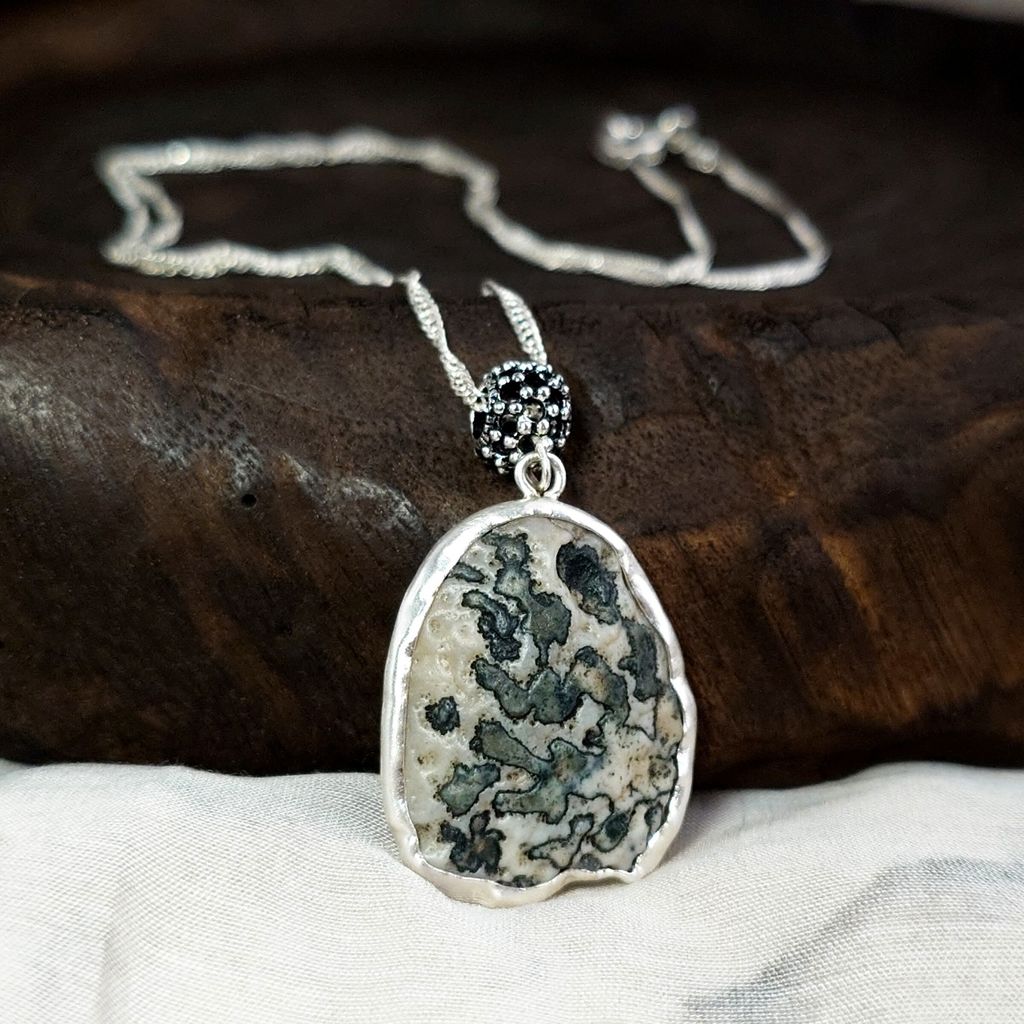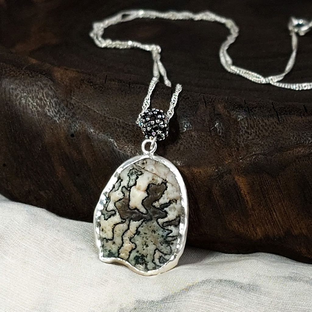 天然戈壁草花石 雙面皆可戴 手工銀飾墜鍊