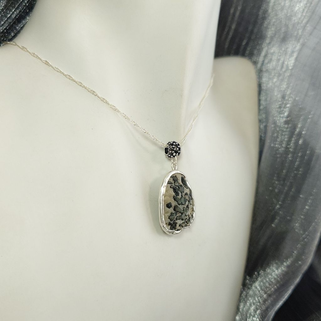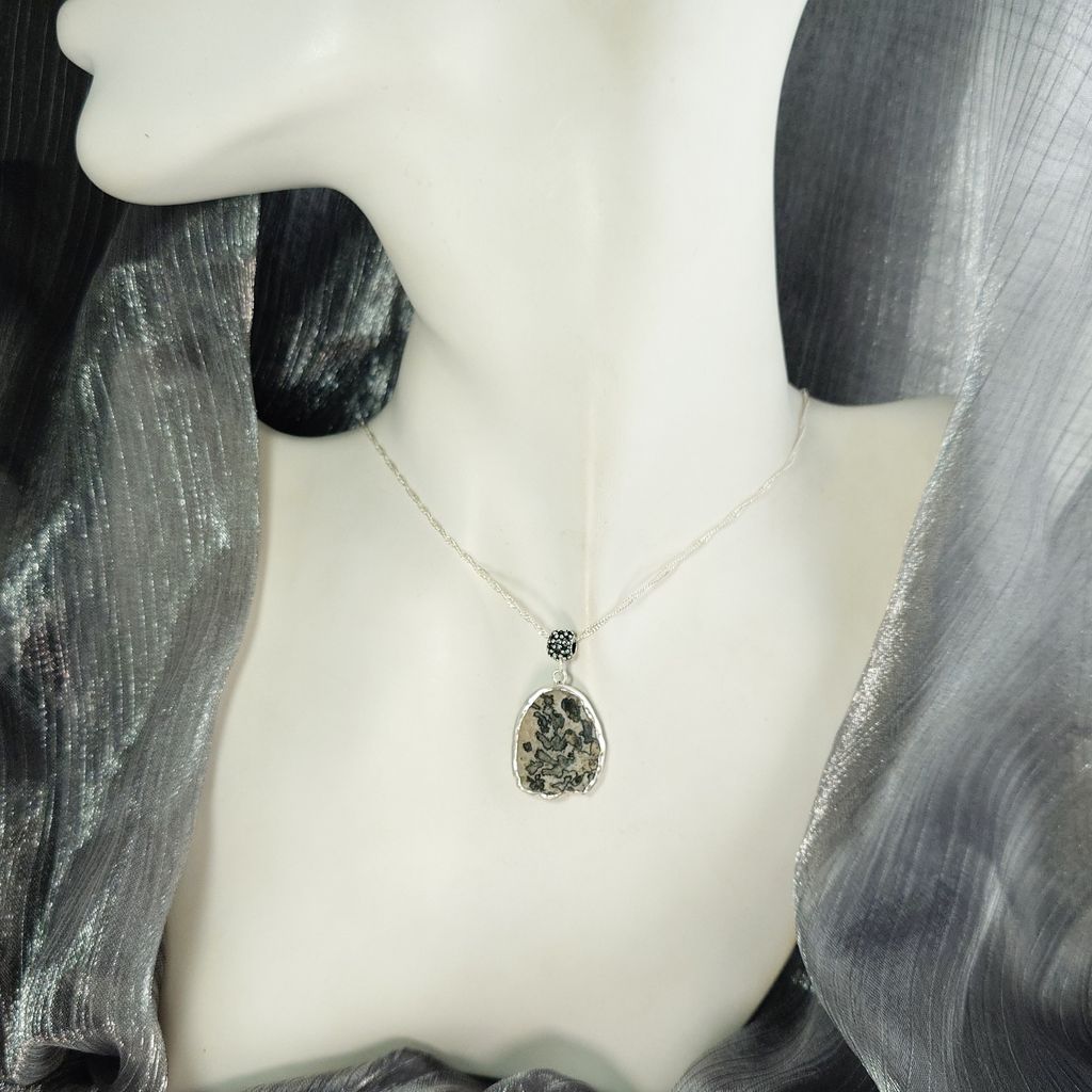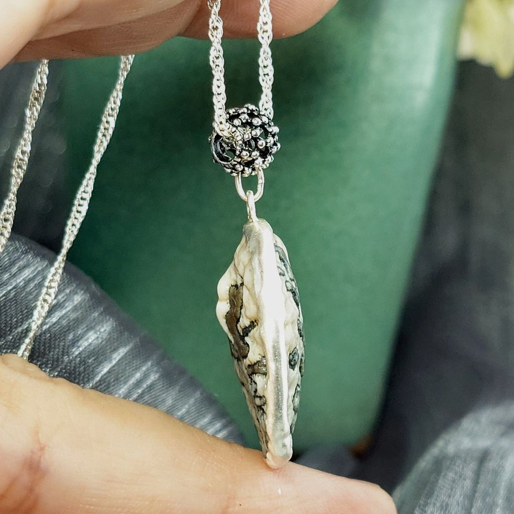 天然戈壁草花石 雙面皆可戴 手工銀飾墜鍊