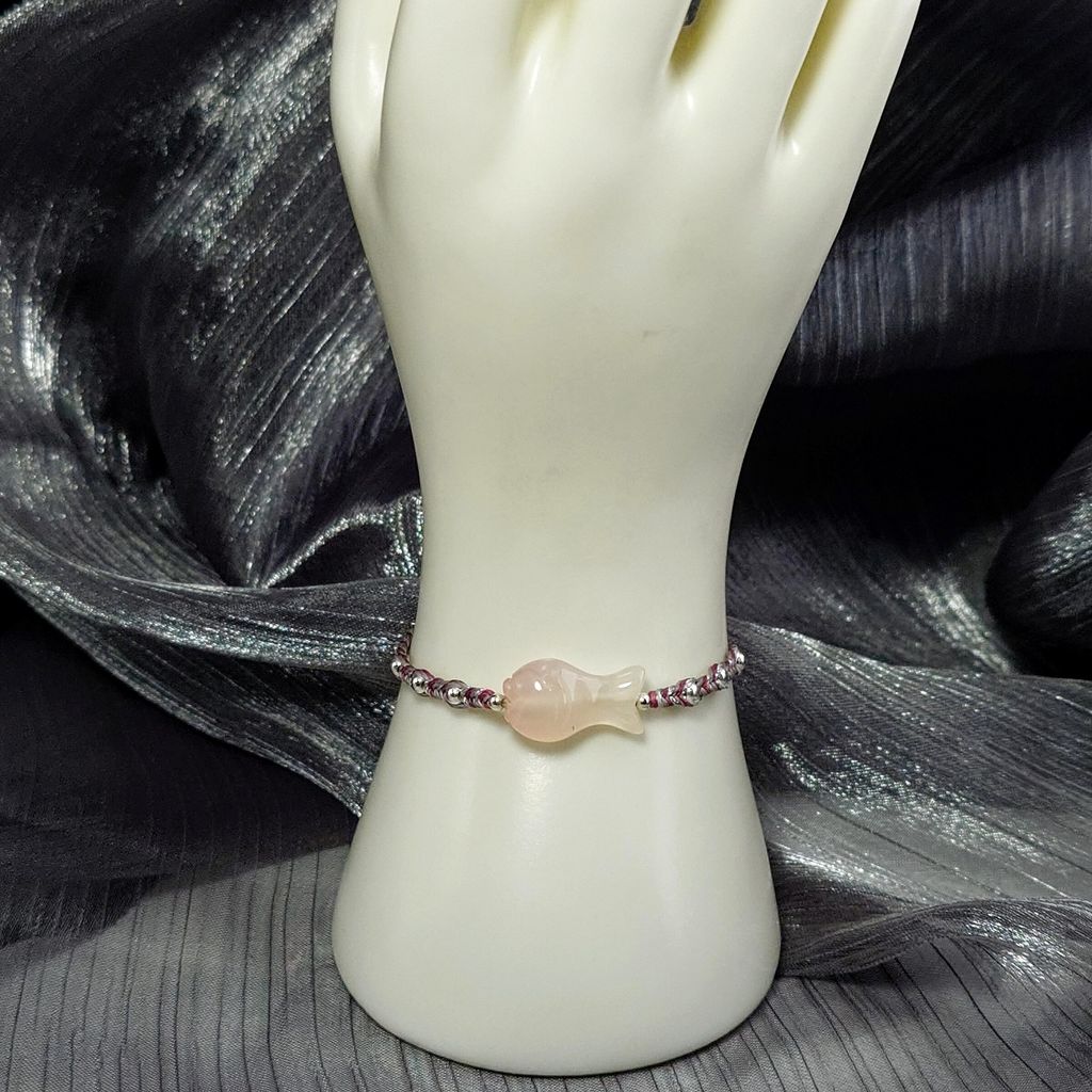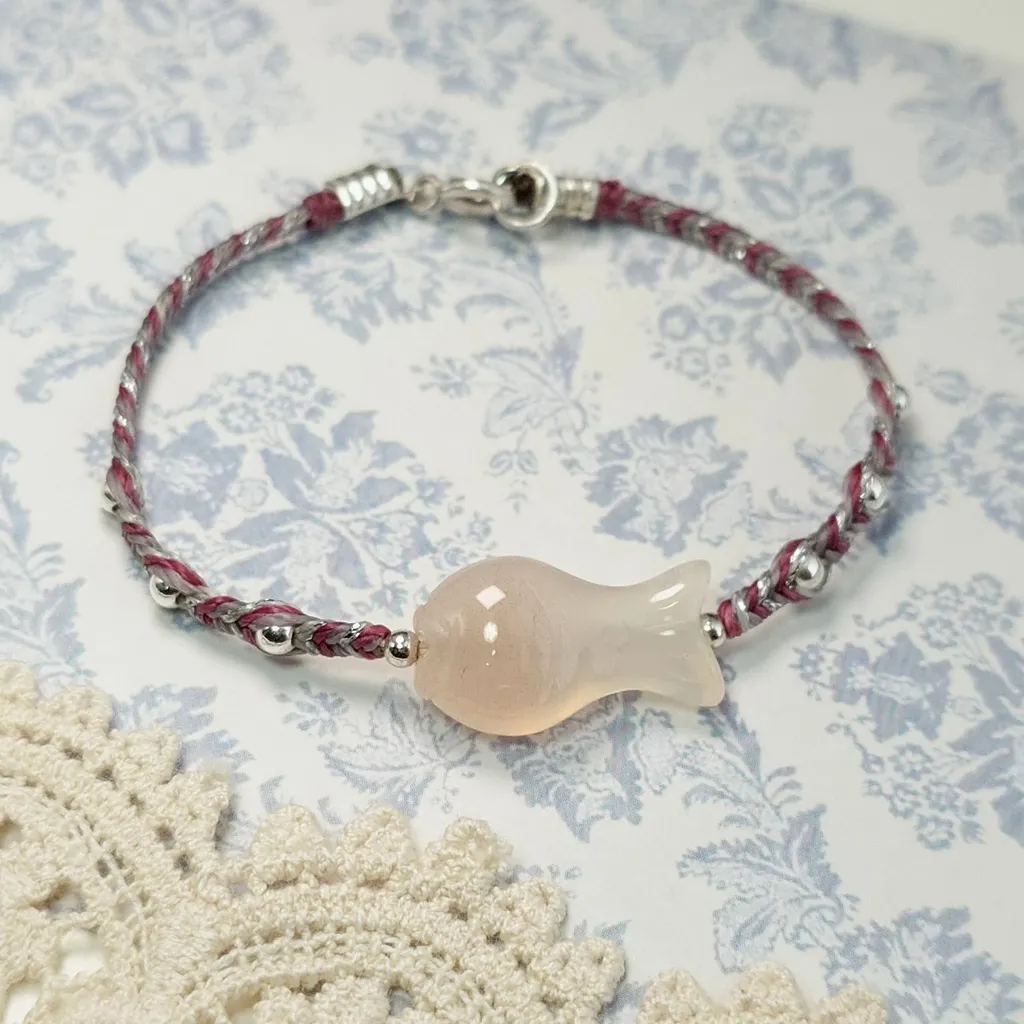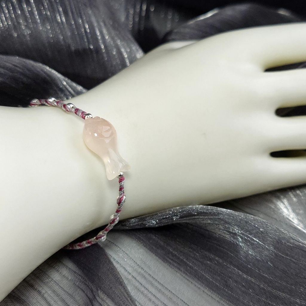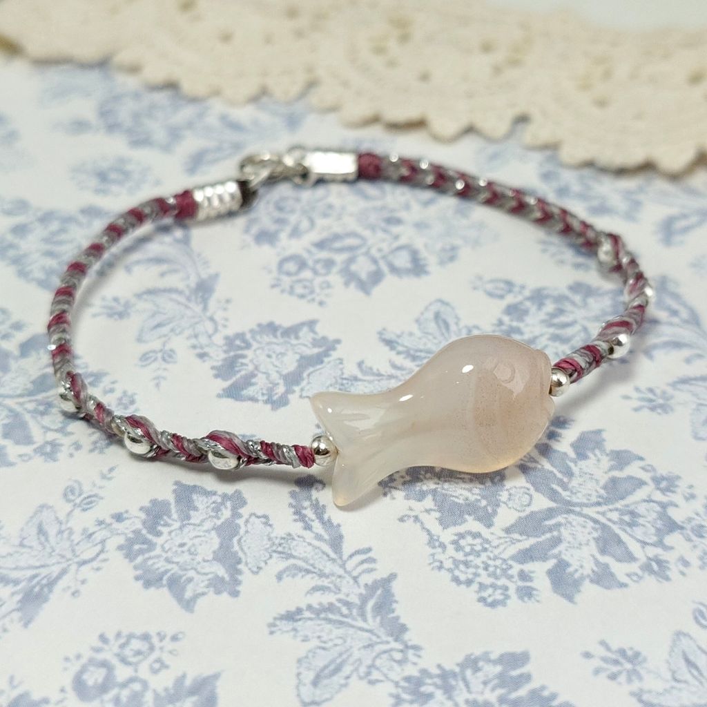 天然 小魚兒 雙面造型雕刻 緋紅瑪瑙 銀珠 蠟線 編織手鍊