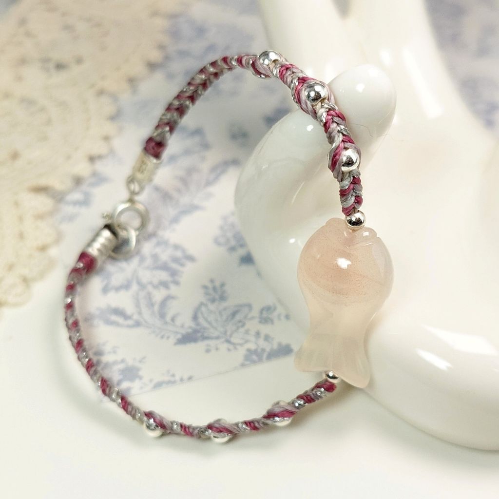 手鍊 緋紅瑪瑙 小魚 銀珠 925銀飾 手繩 蠟線 編織 寶石