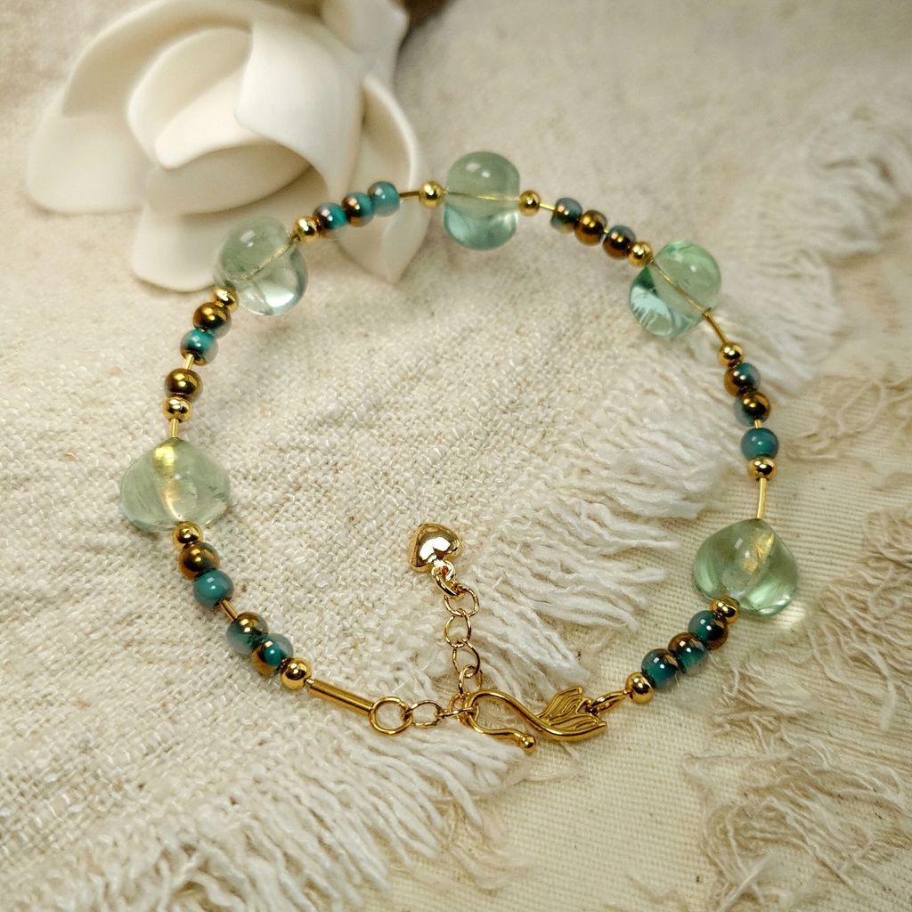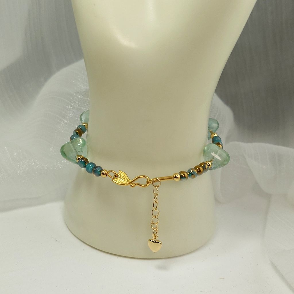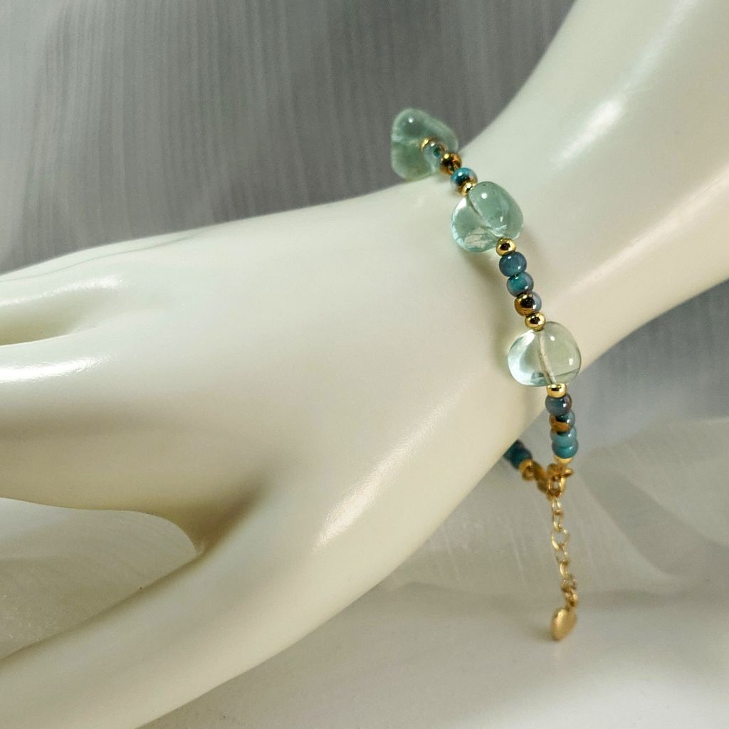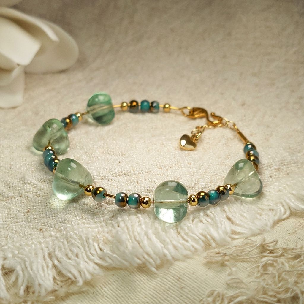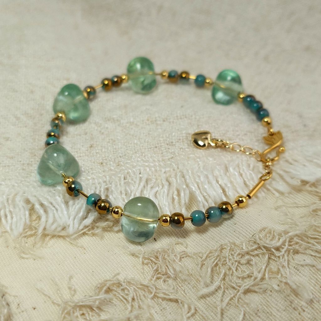 天然 三角形切割 綠螢石 捷克琉璃珠 包金手環