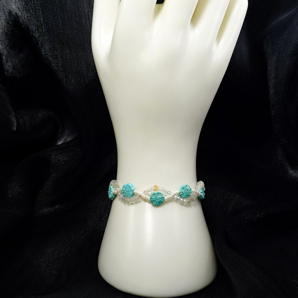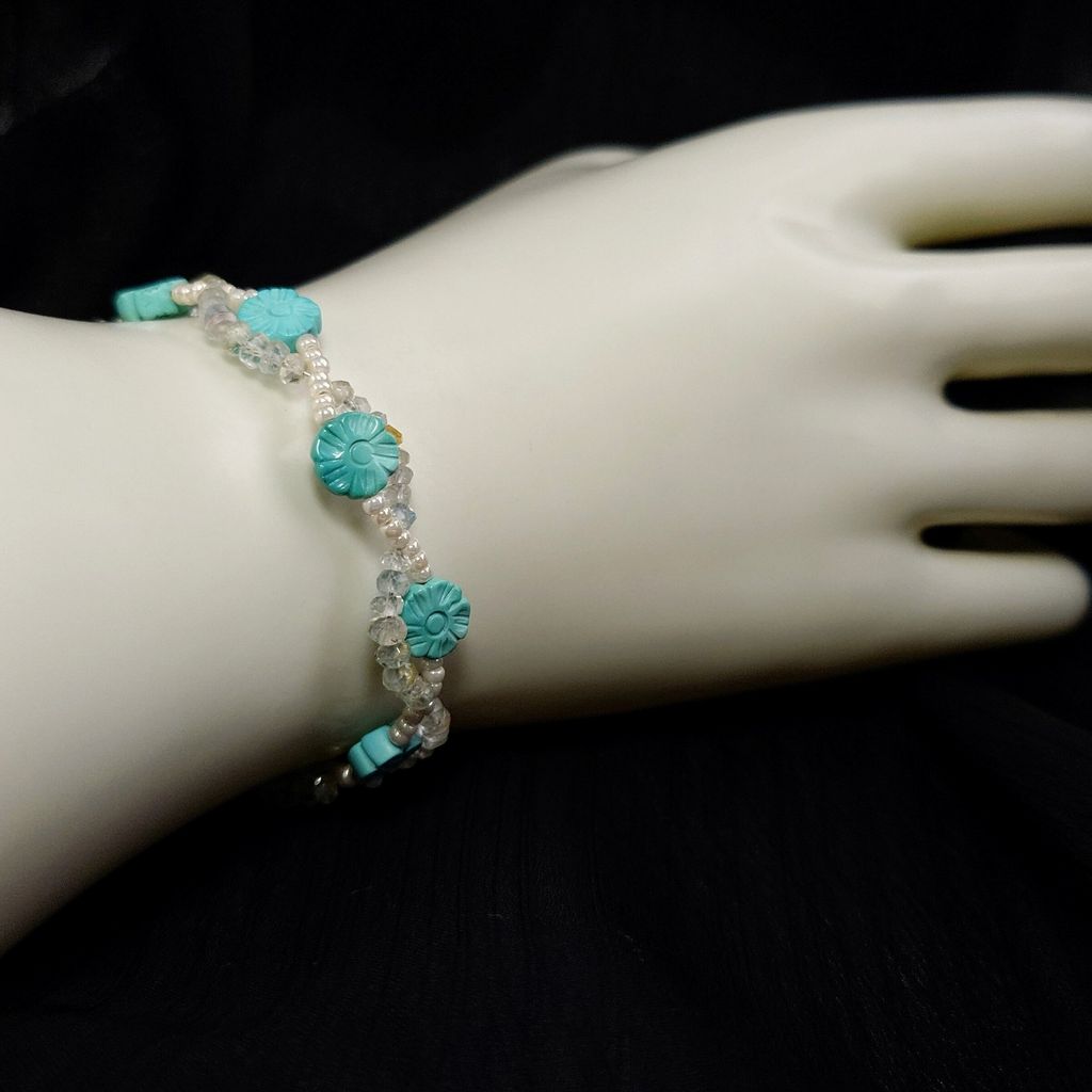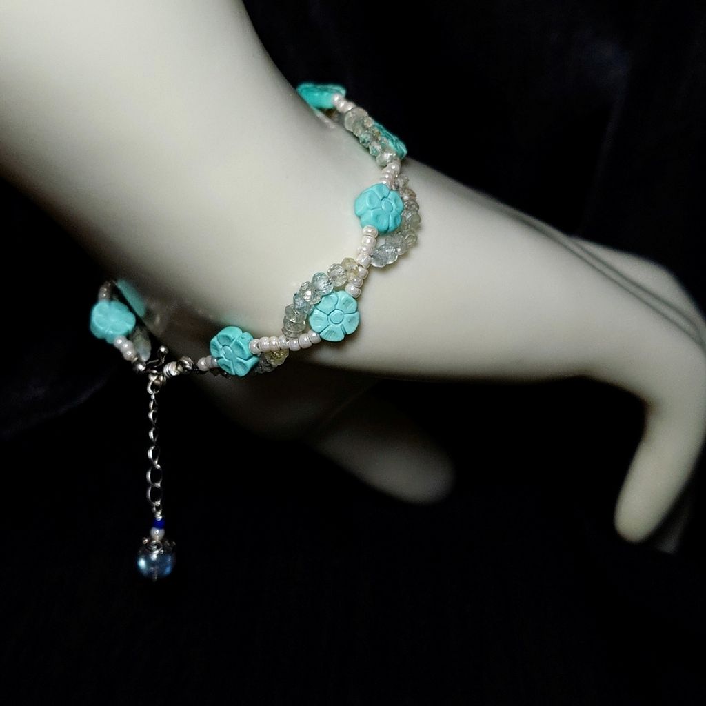 手鍊 天然 高瓷 綠松石 花 海藍寶 琉璃珠 寶石 925銀飾