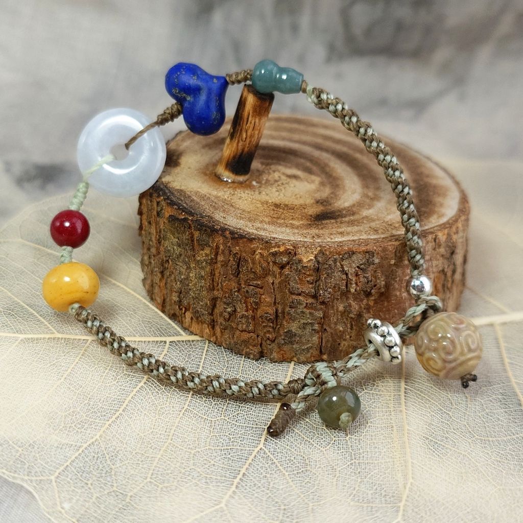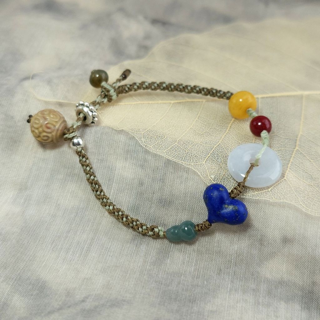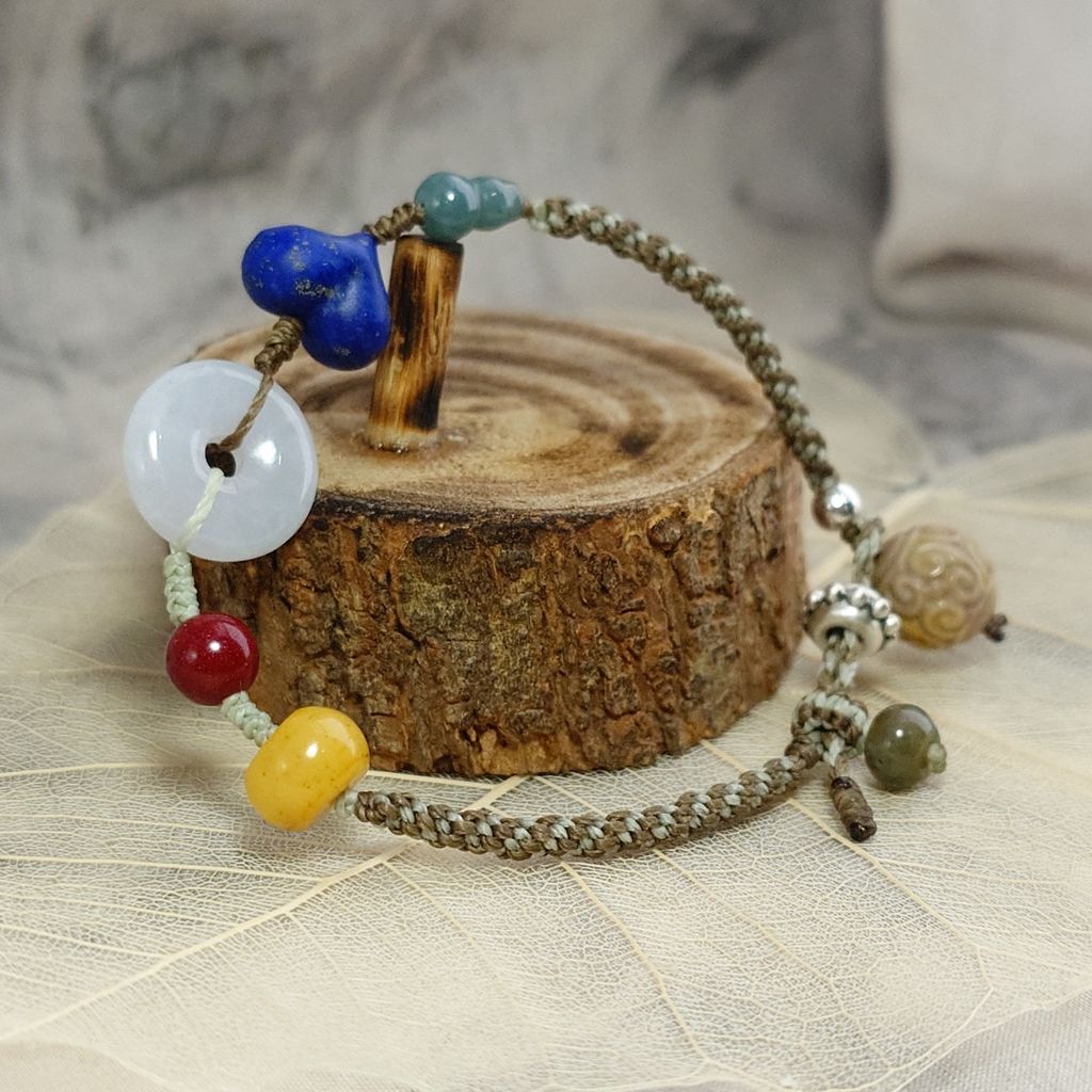 手鍊 五色寶石 綠玉葫蘆 青金石 白玉平安扣 朱砂 蜜蠟 蠟線 銀飾