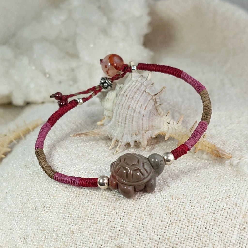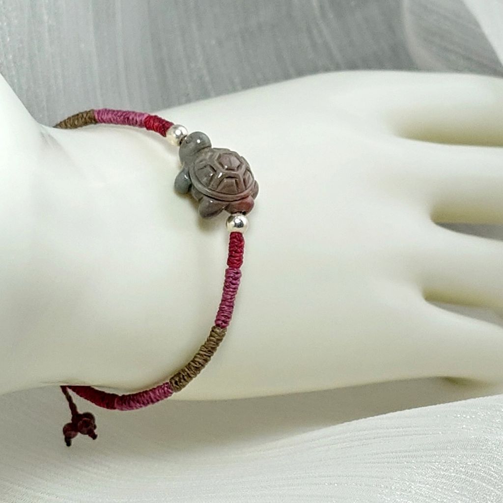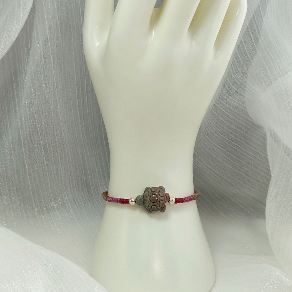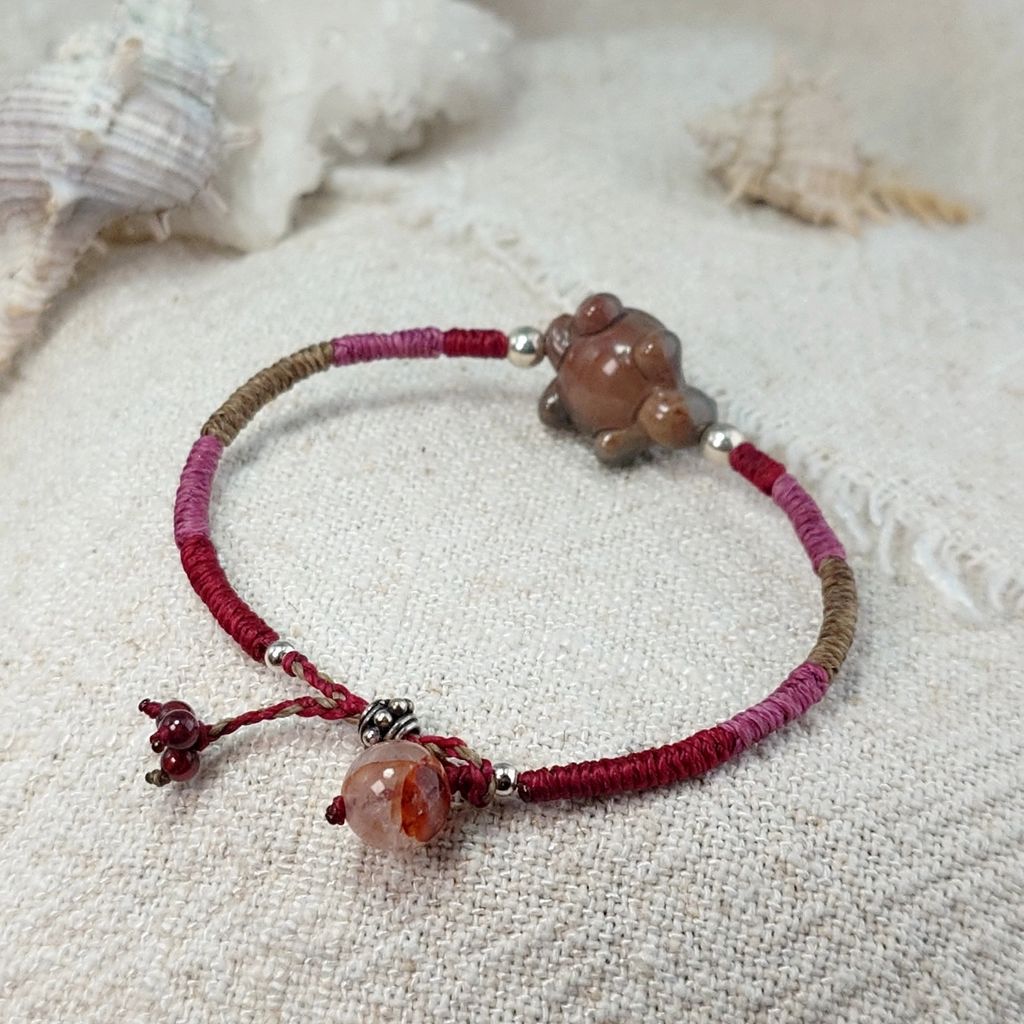可愛小烏龜 立體造形雕刻 阿拉善瑪瑙 膠花水晶 925銀飾 蠟線編織手鍊