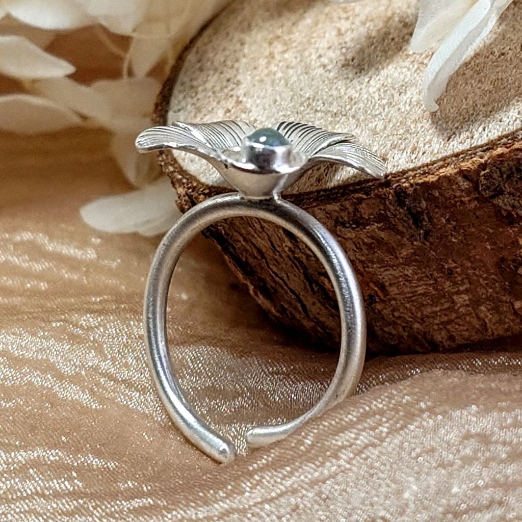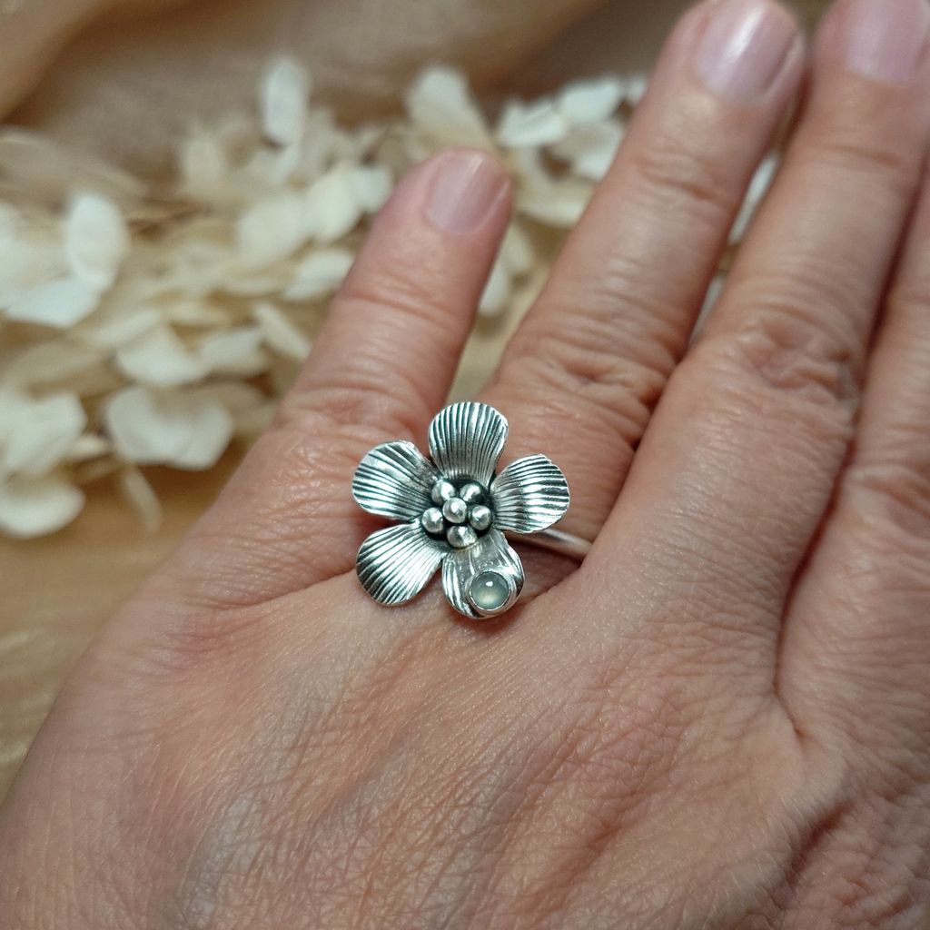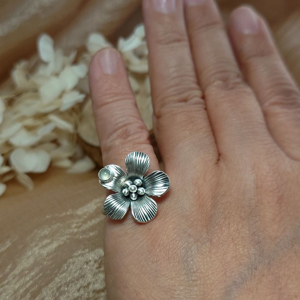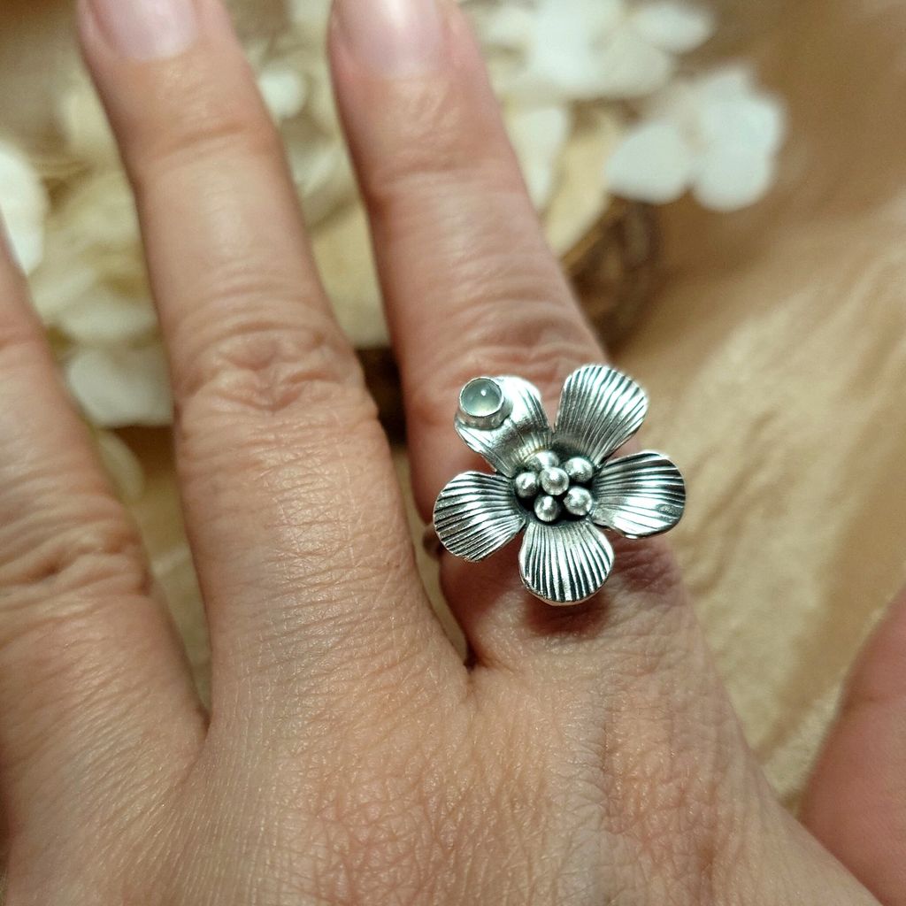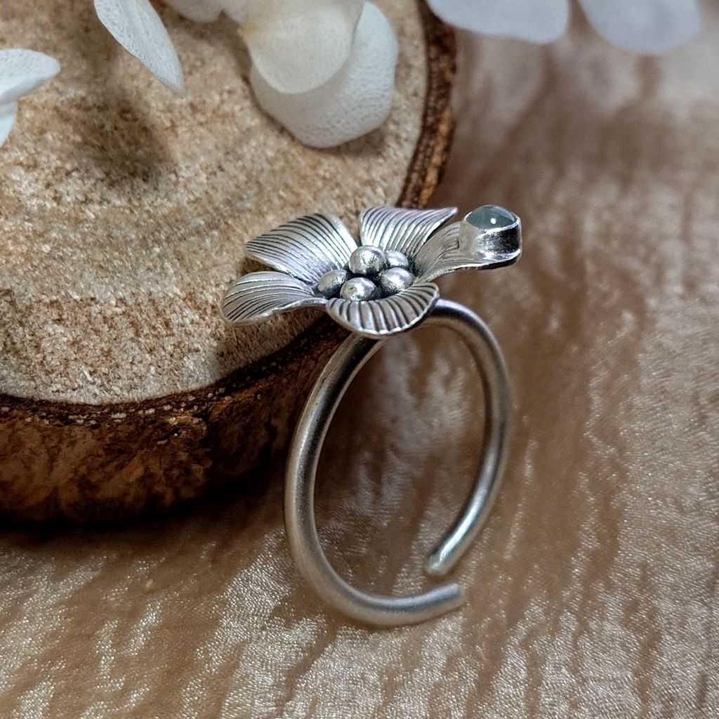 天然 冰透 蛋面白翡翠 鍛敲銀花 手工銀飾戒指