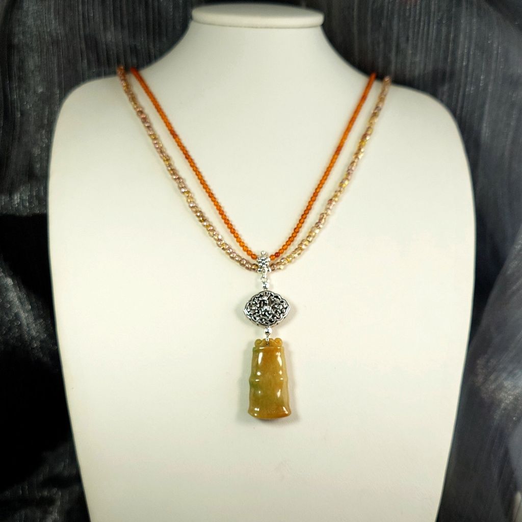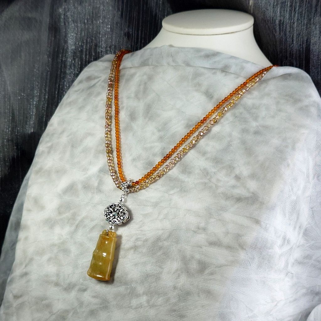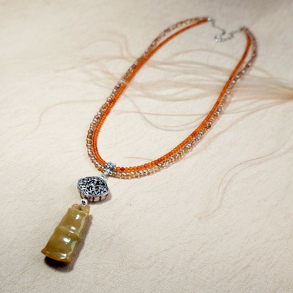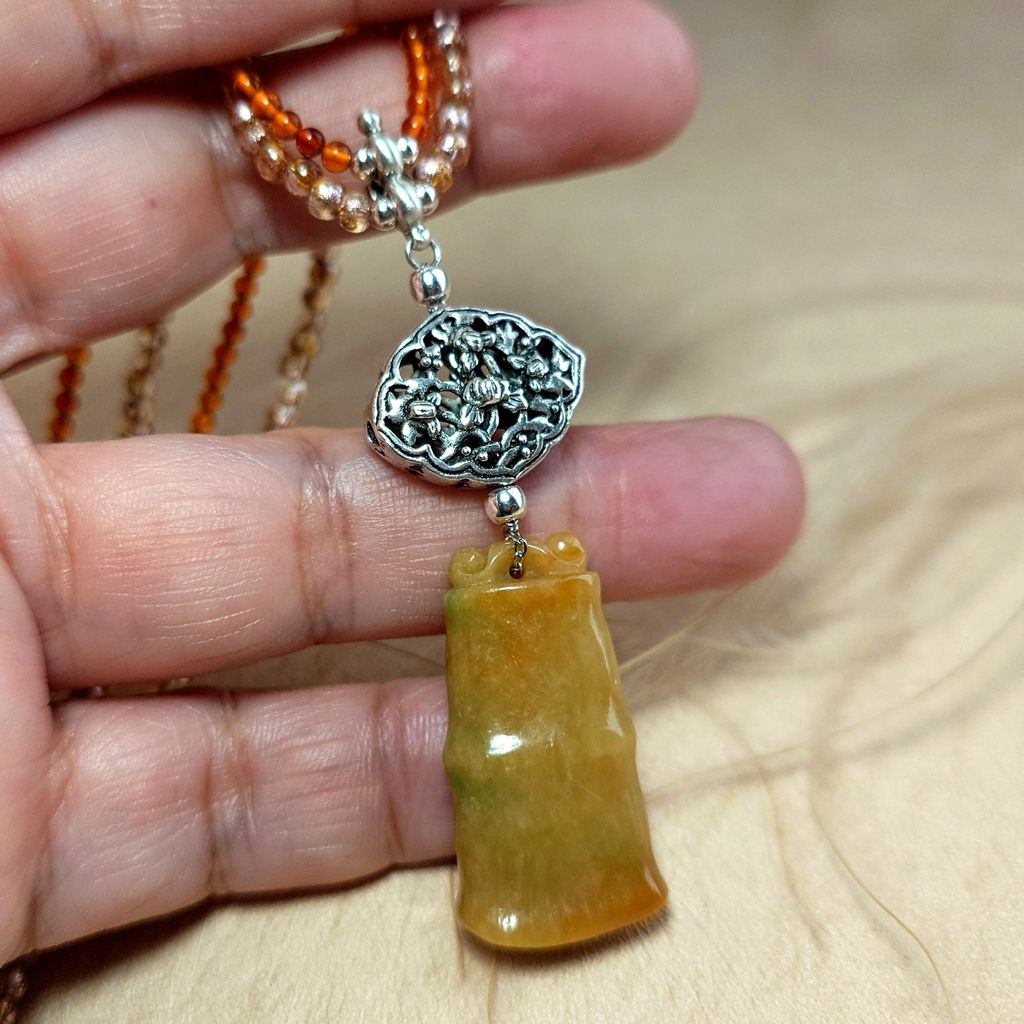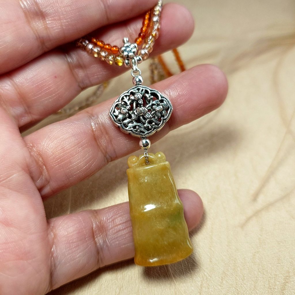 天然冰糯種黃翡翠 竹節造型 金橘色琥珀珠 琉璃珠 雙面鏤空蓮花銀飾長墜鍊