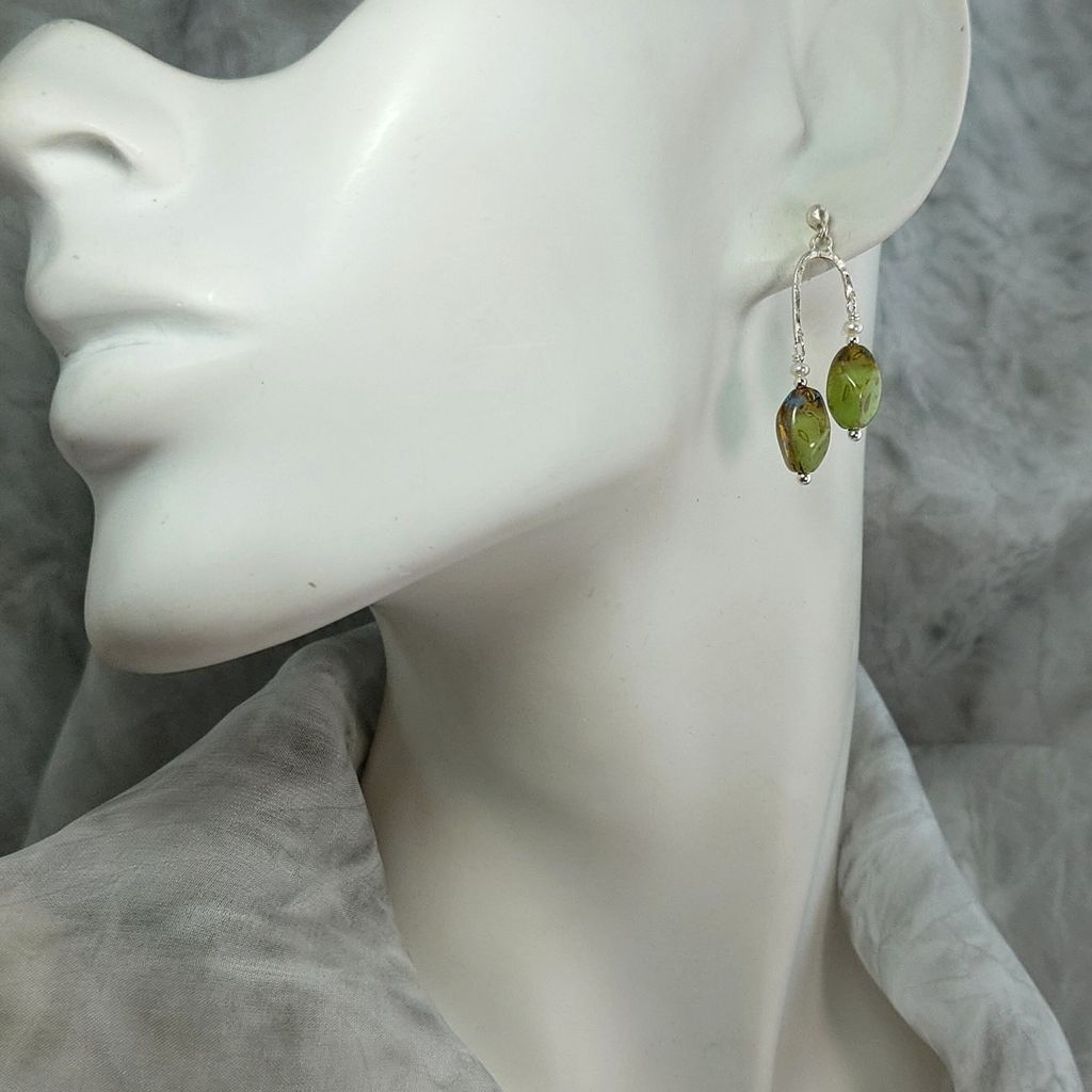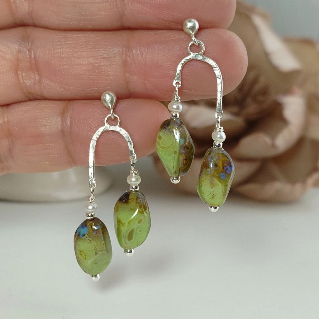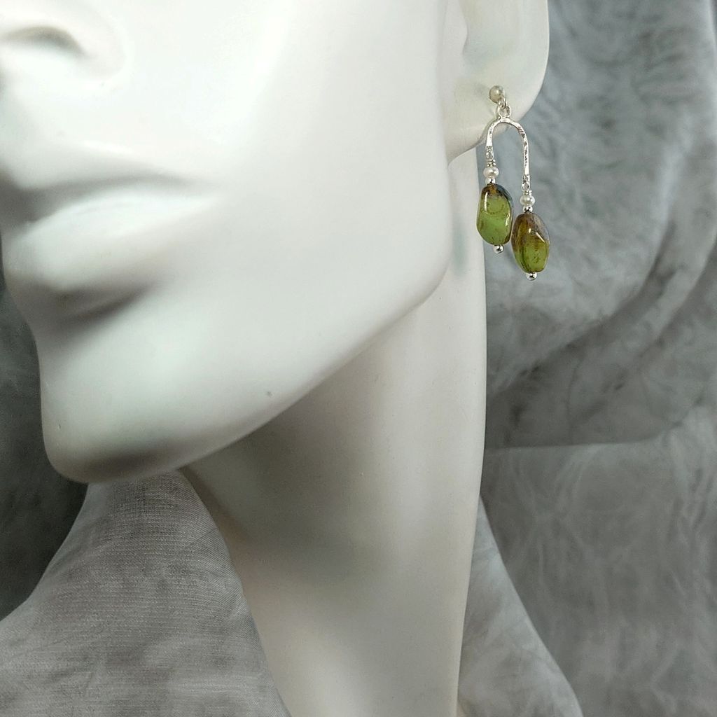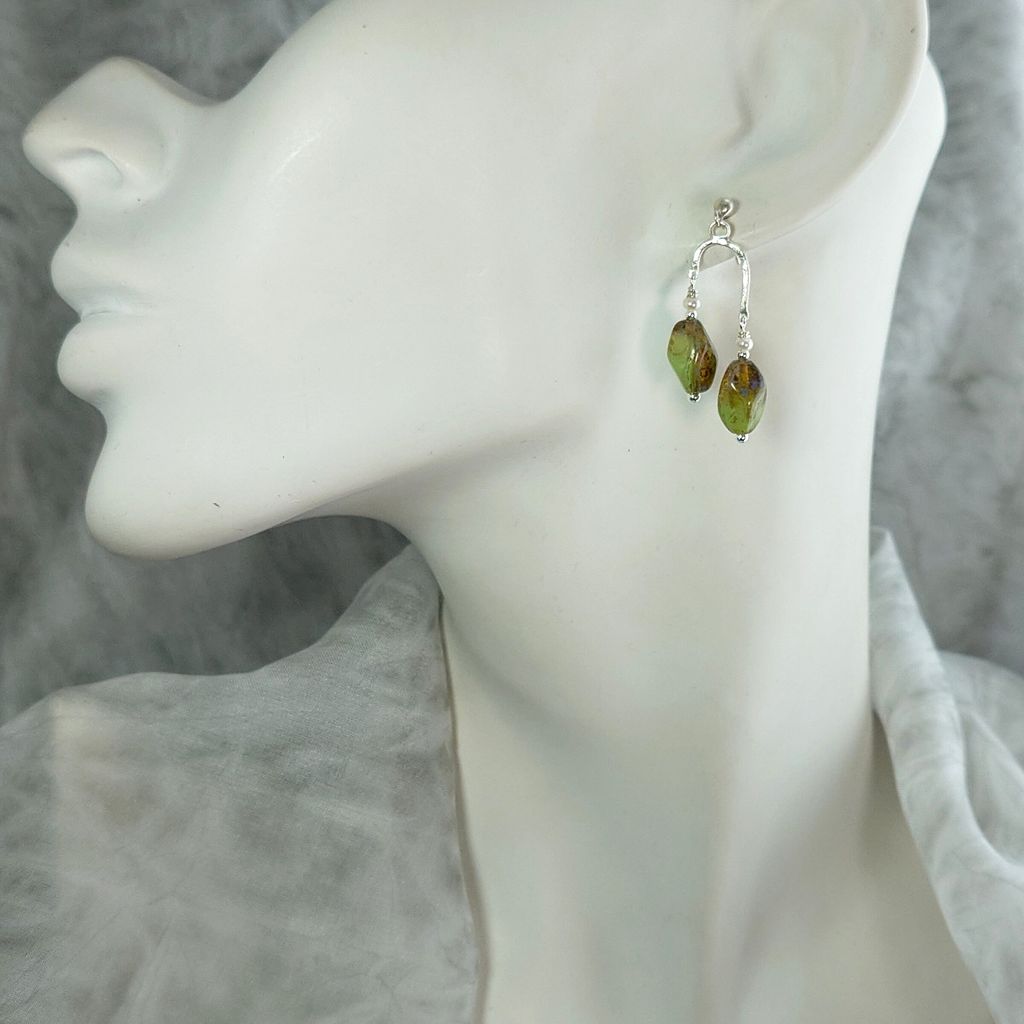 懷舊斑駁感 綠褐色 捷克琉璃珠 小珍珠 手工鍛敲 銀飾耳環