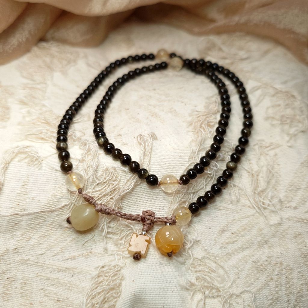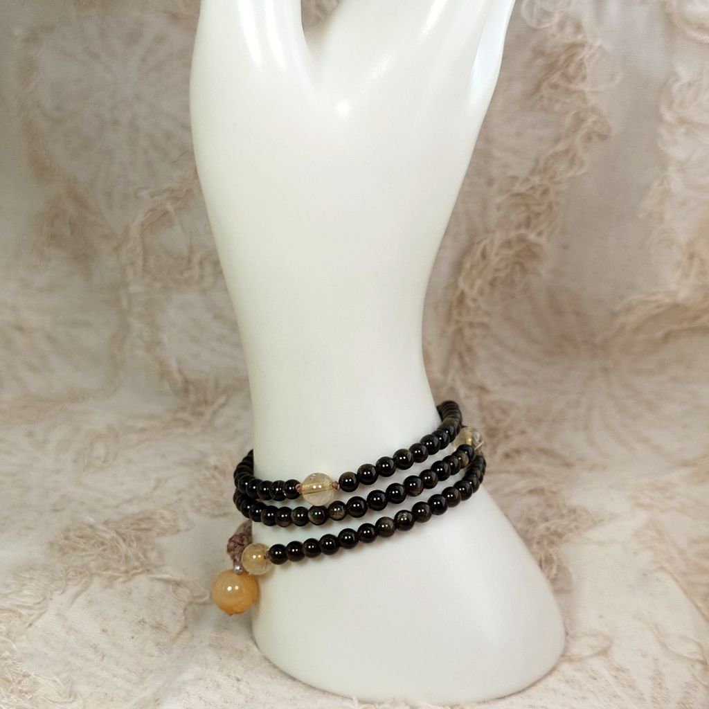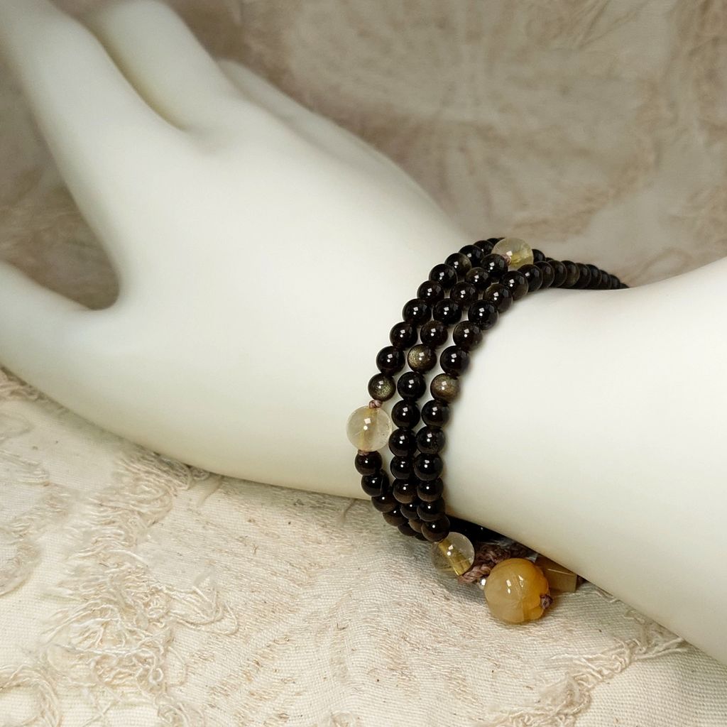 - 念珠主體寶石(1): 天然 直徑4.3mm金曜石珠, 108顆, 每顆在光線照耀下都有美麗的反光金沙。